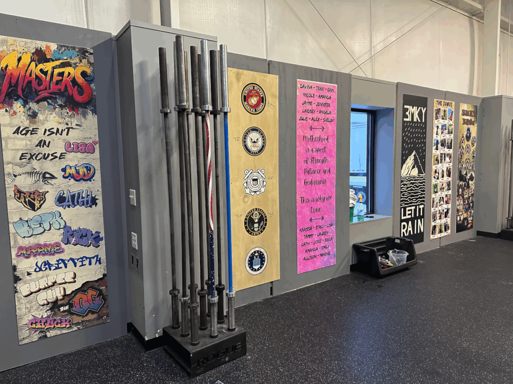 On a car ride back from the CrossFit Masters Competition, we used ChatGPT to generate an idea for the wall walk board. The goal was to create a 2 x 7-foot wooden board themed around Noah’s Ark. This would feature the ‘3MKY’ logo, the phrase ‘Let it Rain,’ and a design evoking strength and resilience in a modern gym setting.